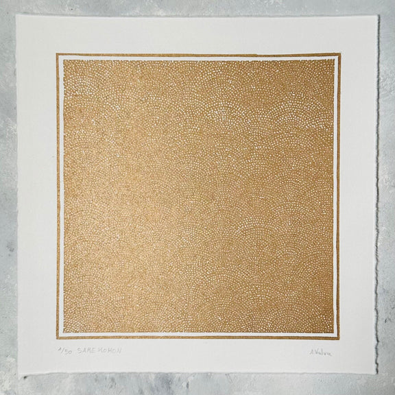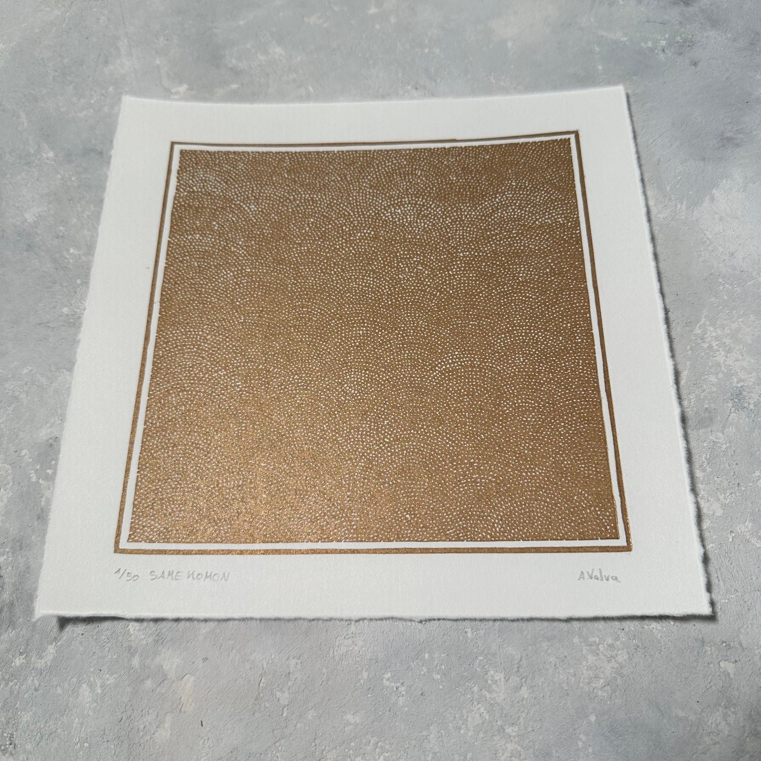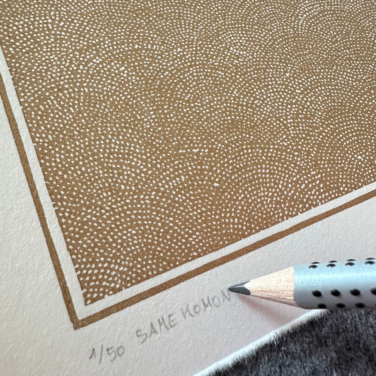 Das Motiv "Same Komon" ist ein handgemachter Linoldruck. Er ist am unteren Rand signiert und nummeriert. Das hochwertige Papier hat eine umlaufende Risskante.