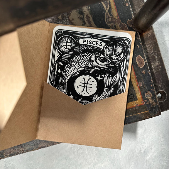 Die Postkarte mit dem Sternzeichen Fische ist ein handgemachter Linoldruck, welcher am unteren Rand signiert ist. Die kunstvoll gestaltete Karte zeigt auf der Vorderseite das detaillierte Sternzeichen Fische. Auf der Rückseite hat die Karte ein Adressfeld.