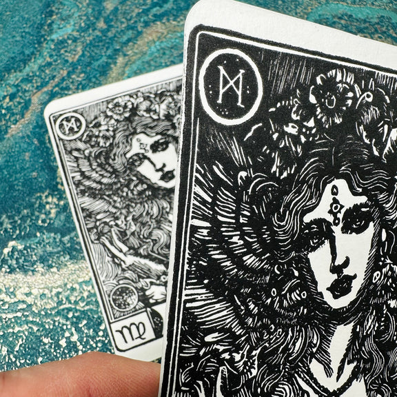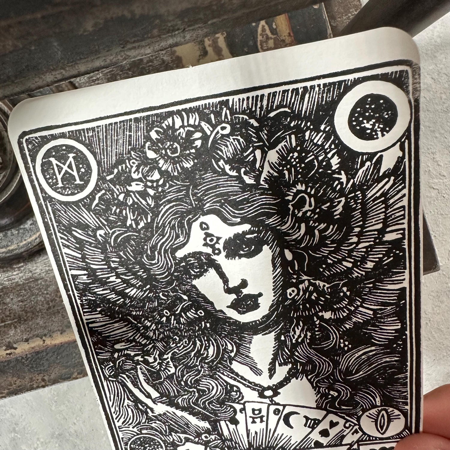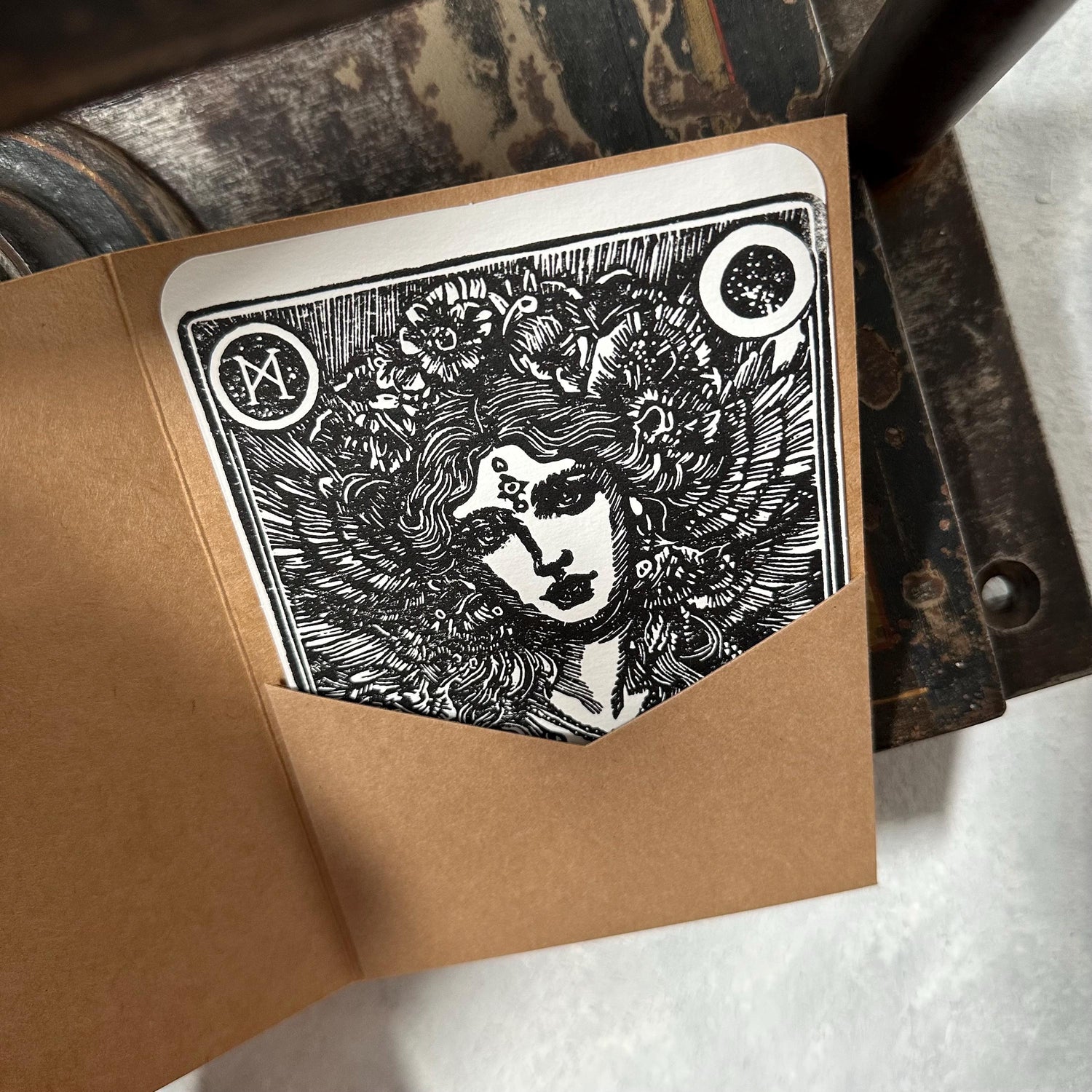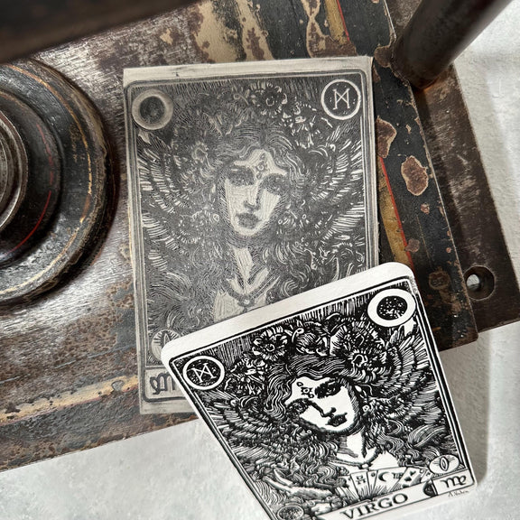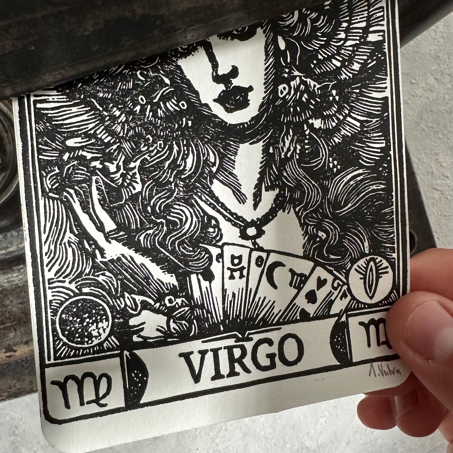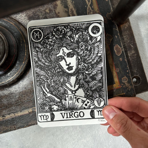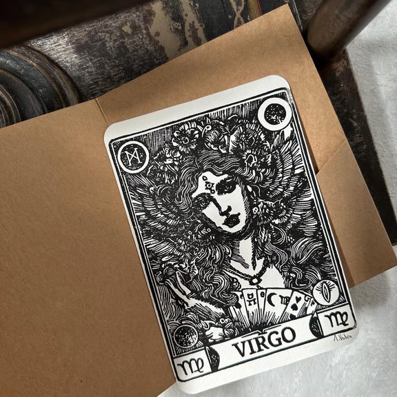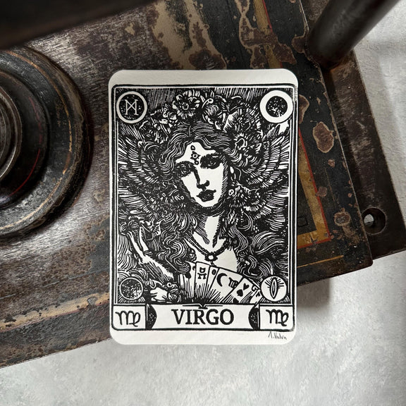 Die Postkarte mit dem Sternzeichen Jungfrau ist ein handgemachter Linoldruck, welcher am unteren Rand signiert ist. Die kunstvoll gestaltete Karte zeigt auf der Vorderseite das detaillierte Sternzeichen Jungfrau. Auf der Rückseite hat die Karte ein Adressfeld.