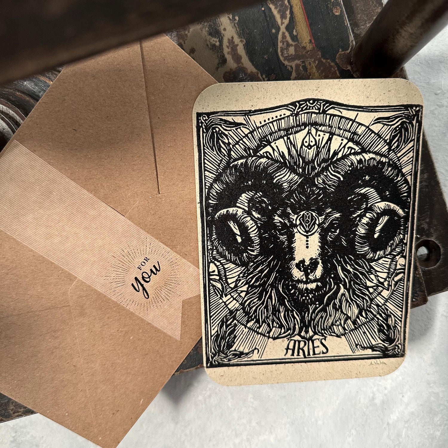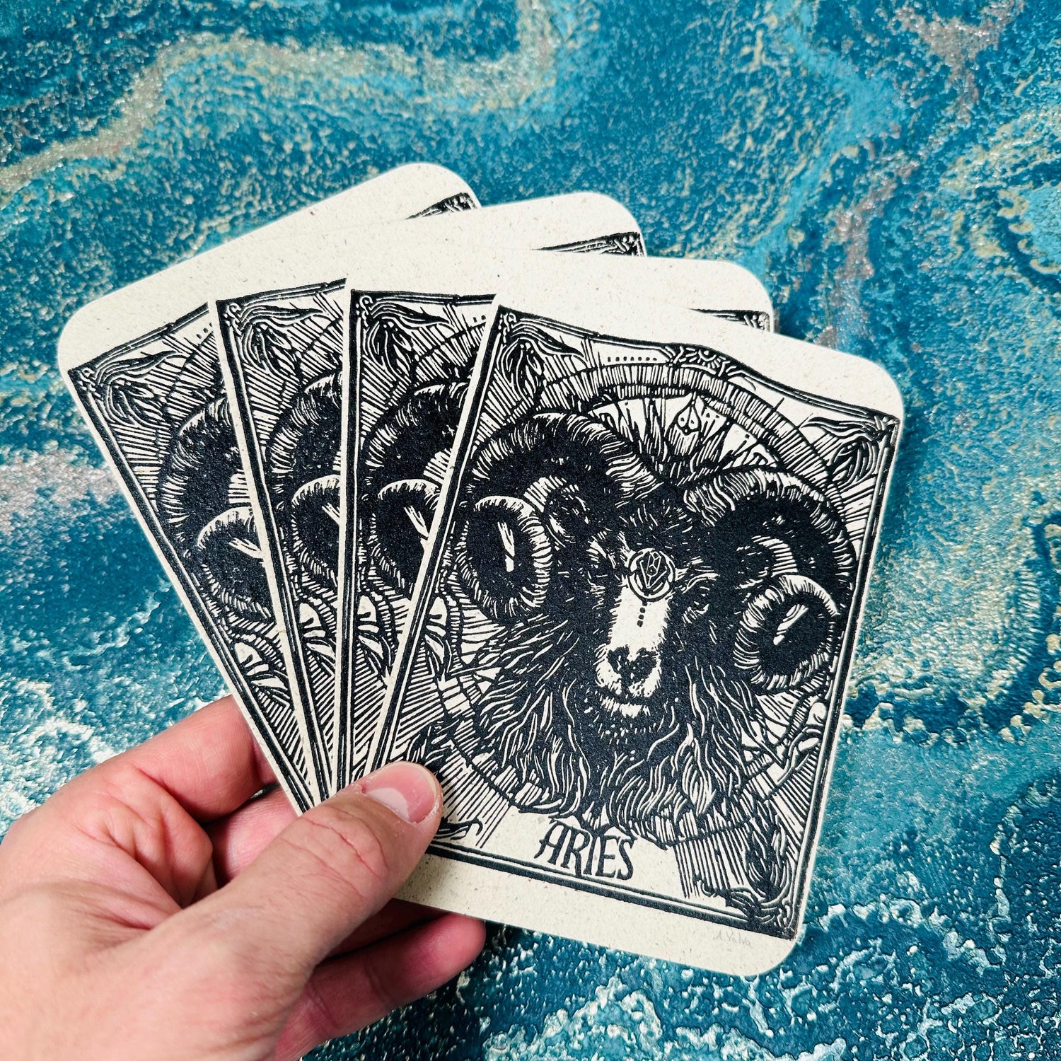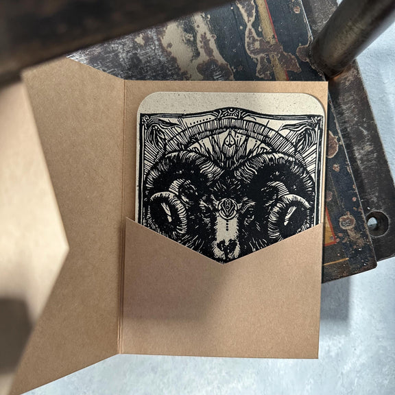 Die Postkarte mit dem Sternzeichen Widder ist ein handgemachter Linoldruck, welcher am unteren Rand signiert ist. Die kunstvoll gestaltete Karte zeigt auf der Vorderseite das detaillierte Sternzeichen Widder.